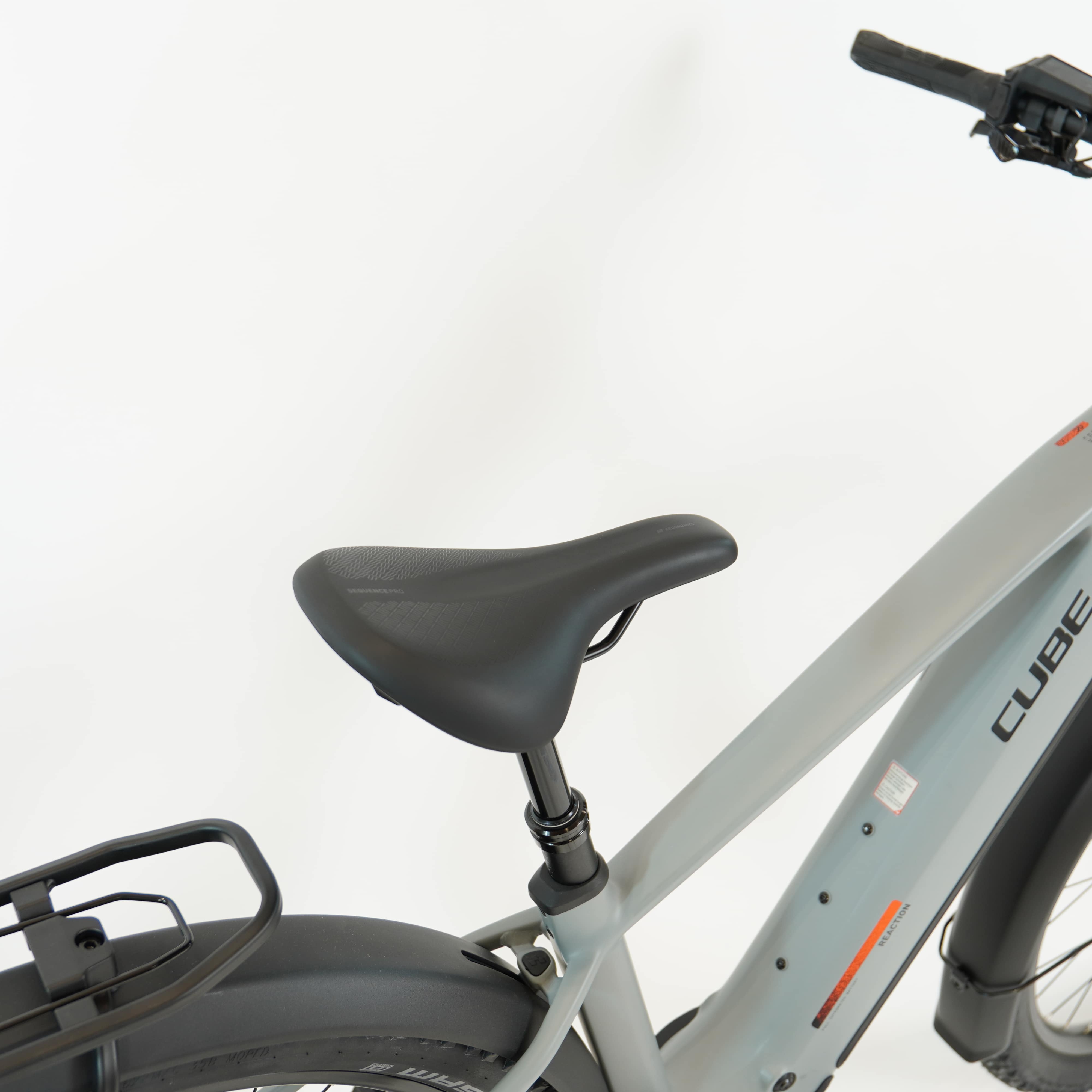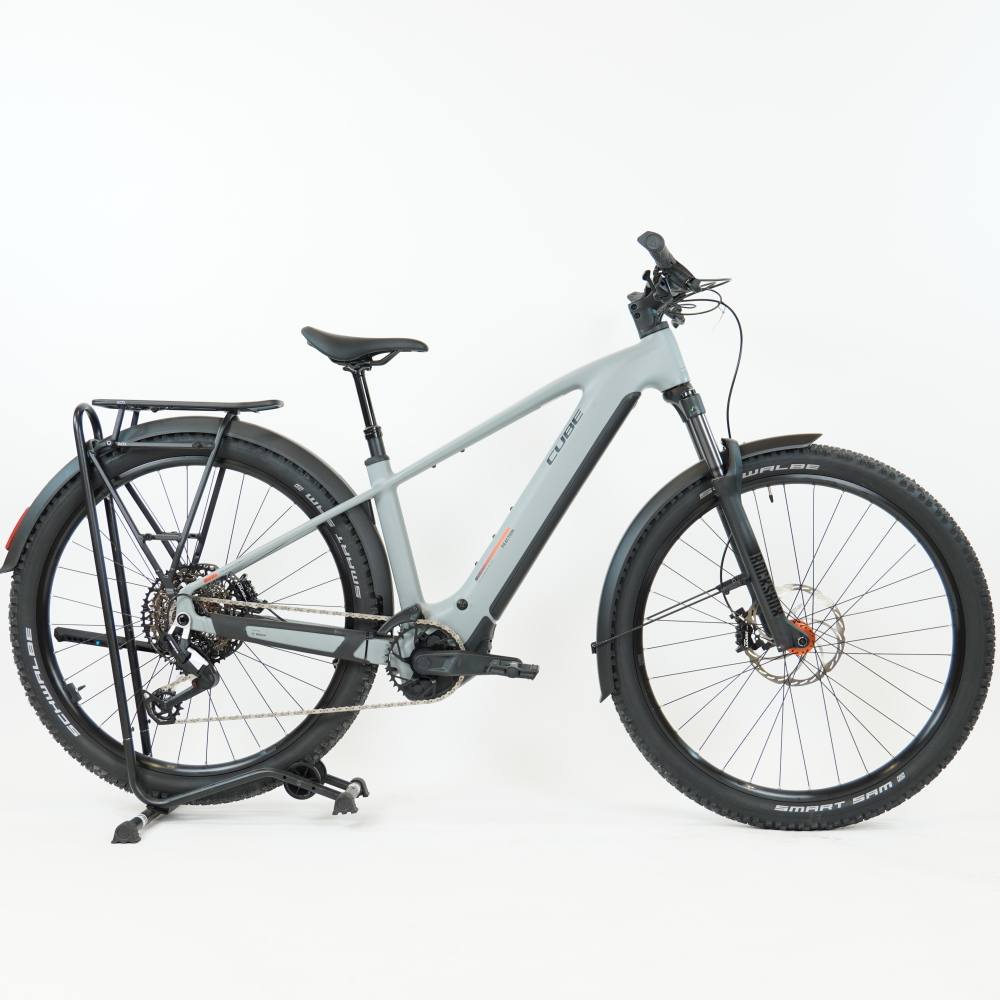 Das Reaction Hybrid Race FE steckt voller praktischer Details. Zum einen ist es standardmäßig mit Schutzblechen, einem robusten Gepäckträger, einem sauber ins Design integrierten Beleuchtungssystem und einem stabilen Seitenständer versehen. Außerdem mit einer versenkbaren Sattelstütze für optimiertes Handling auf steilen Trails. Zum anderen macht die breit gefächerte 12-fach Transmission 90 von Sram selbst anspruchsvolle Routen zum Kinderspiel. Für höchsten Fahrkomfort und 1a-Kontrolle haben wir 2.6 Zoll breite, griffige Schwalbe Pneus und eine einfach einstellbare Rockshox Recon Silver Luftfedergabel mit 120 mm Federweg (100 mm bei den kleinsten Rahmengrößen und den Tiefeinsteiger-Modellen) verbaut. Apropos Kontrolle: Die hydraulischen Louise 4-Kolben-Scheibenbremsen von Magura verzögern das Bike selbst bei Nässe zuverlässig und sicher. Wir haben uns also um alles gekümmert – jetzt heißt's aufsitzen und Spaß haben!
