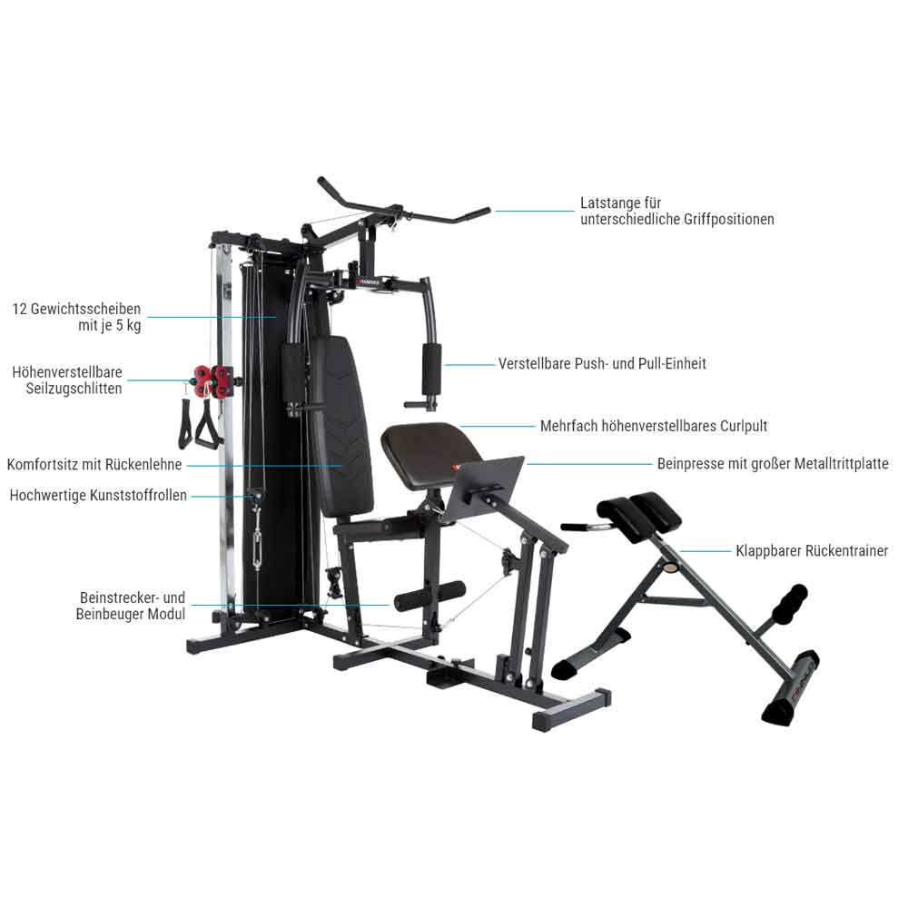 Die Ferrum TX4 bietet Dir verschiedene Push- und Pullmöglichkeiten, um viele verschiedene Übungen in Dein Krafttraining zu integrieren. Das kompakte Multi Gym mit seiner durchdachten Konstruktion eignet sich für Grundübungen und Isolationsübungen. Dein Trainingswiderstand wird mit dem schnell verstellbaren Gewichtsblock reguliert. Du steigerst Dich mit Supersätzen und regst Dein Muskelwachstum an. Zum Beispiel kannst Du die Curl- und Latstange für verschiedene Kraftübungen verwenden und zusätzlich mit dem Rückentrainer Deine Muskulatur im unteren Lendenbereich stärken. Mit der Ferrum TX4 steht Dir ein gezieltes Training Deiner Muskelgruppen bevor. Starte Dein „Body Upgrade“ mit der neusten Technik, kompakt und bei Dir zu Hause.