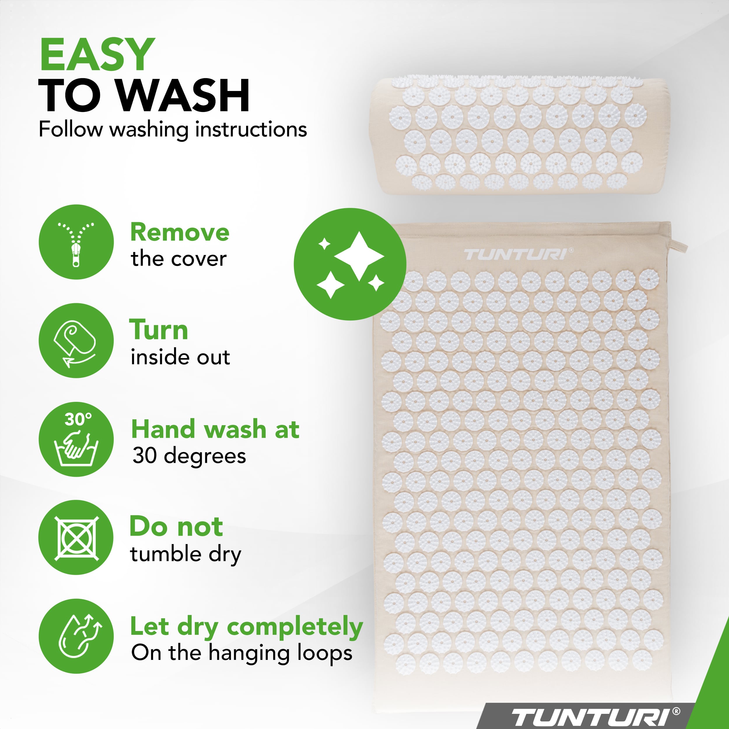 Die Tunturi Akupressurmatte besteht aus einem Kissen, einer Matte und einer Tragetasche. So können Sie das Set einfach mitnehmen oder ordentlich aufbewahren. Die Bezüge von Kissen und Matte, die aus hautfreundlicher Baumwolle bestehen, schließen rundherum vollständig ab. Das ganze Set ist somit sauber verarbeitet. Die Bezüge sind leicht abnehmbar und können mit der Hand gewaschen werden.