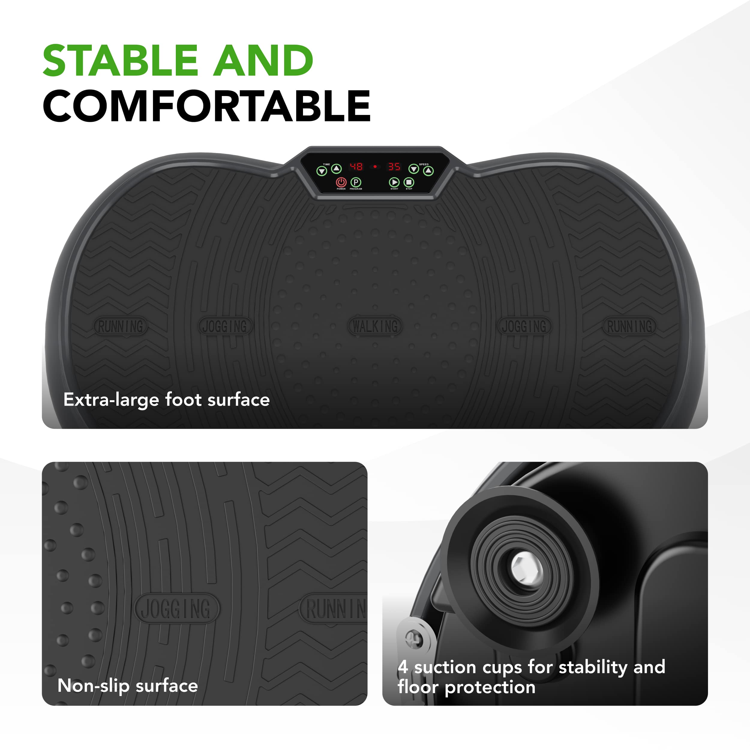 Das V40 wurde für den Heimgebrauch entwickelt, wobei Sicherheit und Komfort im Vordergrund stehen. Sie können sowohl schmal als auch breit auf der extra großen rutschfesten Oberfläche stehen, und die vier Saugnäpfe sorgen dafür, dass die Vibrationsplatte auch auf glatten Böden stabil bleibt. Das LED-Display zeigt alle wichtigen Informationen auf einen Blick: Zeit, Geschwindigkeit und Programme. So können Sie sich ganz auf Ihr Training konzentrieren, ohne abgelenkt zu werden, auch wenn Sie noch keine Erfahrung mit Vibrationsplatten haben.