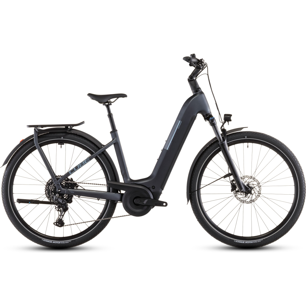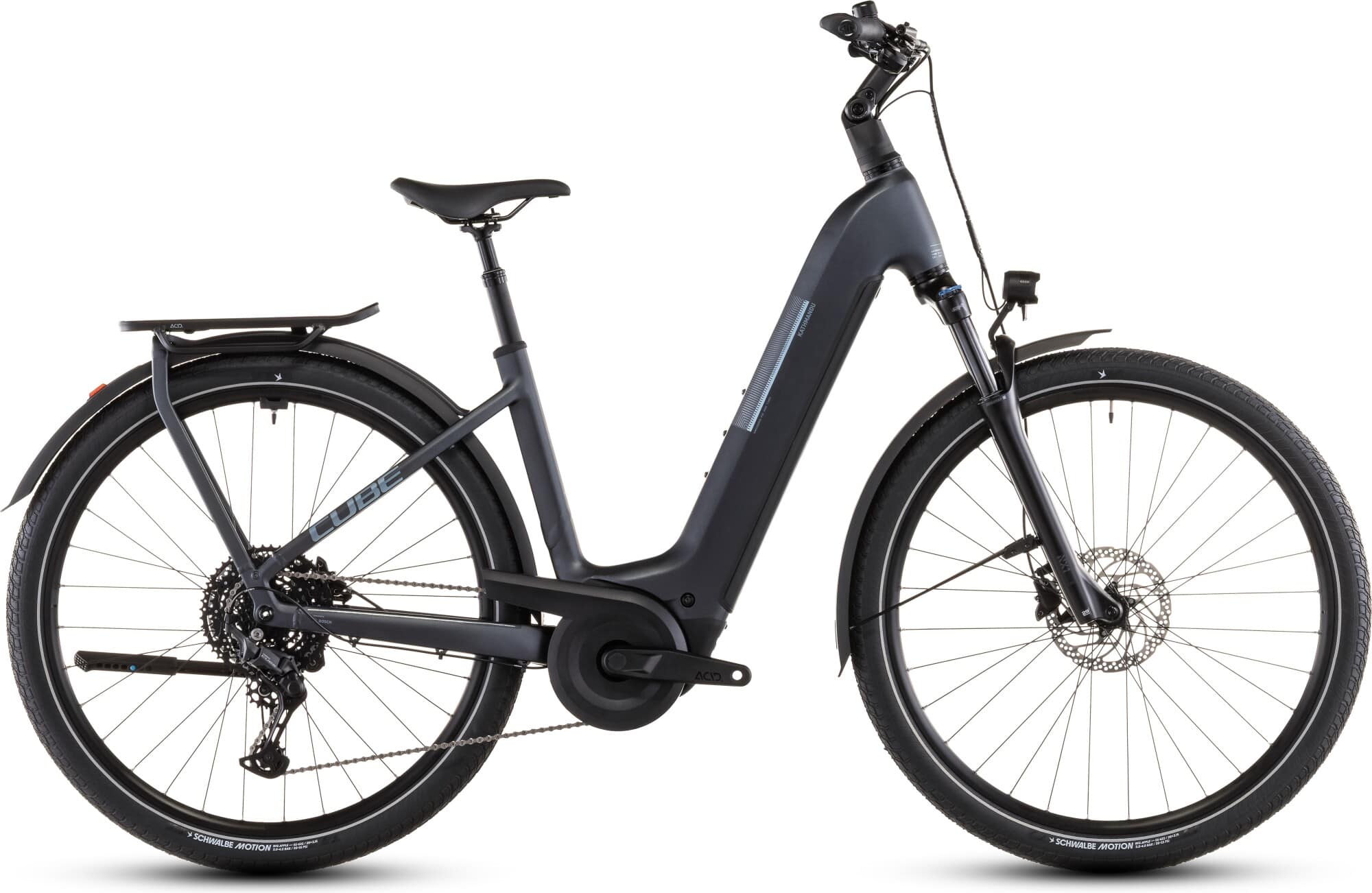Anyone travelling on the CUBE Kathmandu Hybrid ONE can give free rein to their thirst for adventure. This bike is equipped with an 800 Wh PowerTube battery, which reliably propels the powerful Bosch CX drive with up to 85 Nm of torque. It also has an easy-to-operate, wide-ranging Cues 10-speed gear system from Shimano, which brings this power to the road in a well-dosed manner. So every route becomes a walk in the park! In terms of comfort, the Suntour air suspension fork, suspension seat post and adjustable stem provide valuable services, especially on long days in the saddle. Safe, reliable braking power in all weathers is the speciality of the powerful hydraulic Shimano disc brakes. Also on board is a complete accessory set, consisting of a lighting system, mudguards and, of course, our integrated IC 3.0 pannier rack. In other words: this e-bike is always ready for all discovery tours!