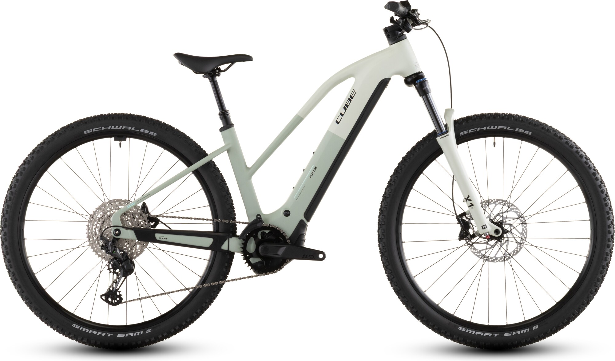 The Reaction Hybrid combines the versatility of a mountain bike with the support of an electric motor and CUBE's clever design: thanks to its smooth-running, powerful Bosch CX drive and 800 Wh battery, plenty of power and range are guaranteed on any route, whether on tarmac or off-road. The easy-to-operate Shimano XT 12-speed gears make even steep climbs child's play. Downhill, the hydraulic 4-piston disc brakes from Shimano provide powerful braking power and the grippy Schwalbe 2.6 inch tyres provide reliable and safe deceleration. For an extra dose of riding comfort and control on rougher trails, we have fitted an air suspension fork with 120 mm travel (100 mm for small frame sizes and all step-through models) and a retractable seat post. Conclusion: The bike is ready - now it's your turn!