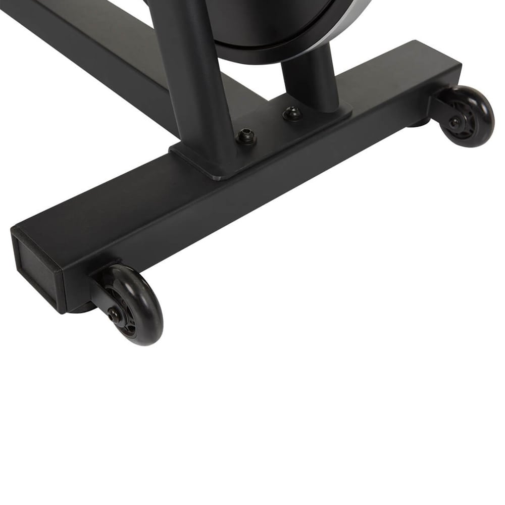 The 4-point support system has height adjustment caps attached to the feet. These offer you the perfect ground balance and a stable stand. The high-quality and sporty construction of the RACER S guarantees you a safe feeling even during your high-speed sessions and powerful pedal strokes while standing. Mobility is no problem for the RACER S despite its stable construction, because equipped with two premium transport wheels at the front leg, your Indoor Cycle RACER S can easily be moved to the desired place.