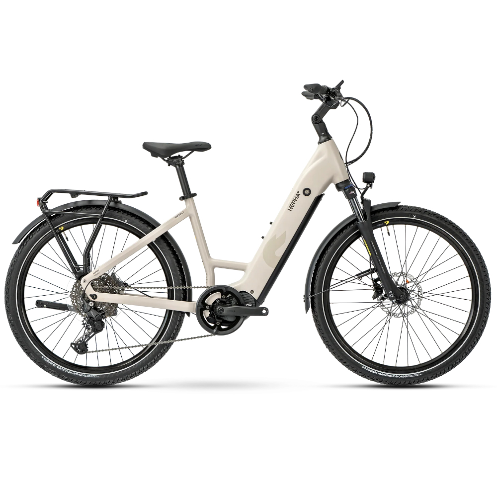 The Trekking 7 Ultra is not the most successful trekking e-bike model for nothing, because the name says it all: ultra powerful, ultra long-lasting, ultra versatile. This is why the powerful HEPHA P101 motor is used, which with 100 Nm offers more power than many other e-trekking bikes on the market. The efficient drive is powered by a large battery, which with its 800 Wh easily conquers even long tours. Comfort and grip are guaranteed by the 80 mm suspension travel of the fork, which absorbs vibrations and shocks. As a result, it easily masters daily city rides, tours in the countryside and longer excursions. The powerhouse is available as a high-step or low-step frame version in dark brown or warm grey - always with a classy HEPHA aluminium frame.