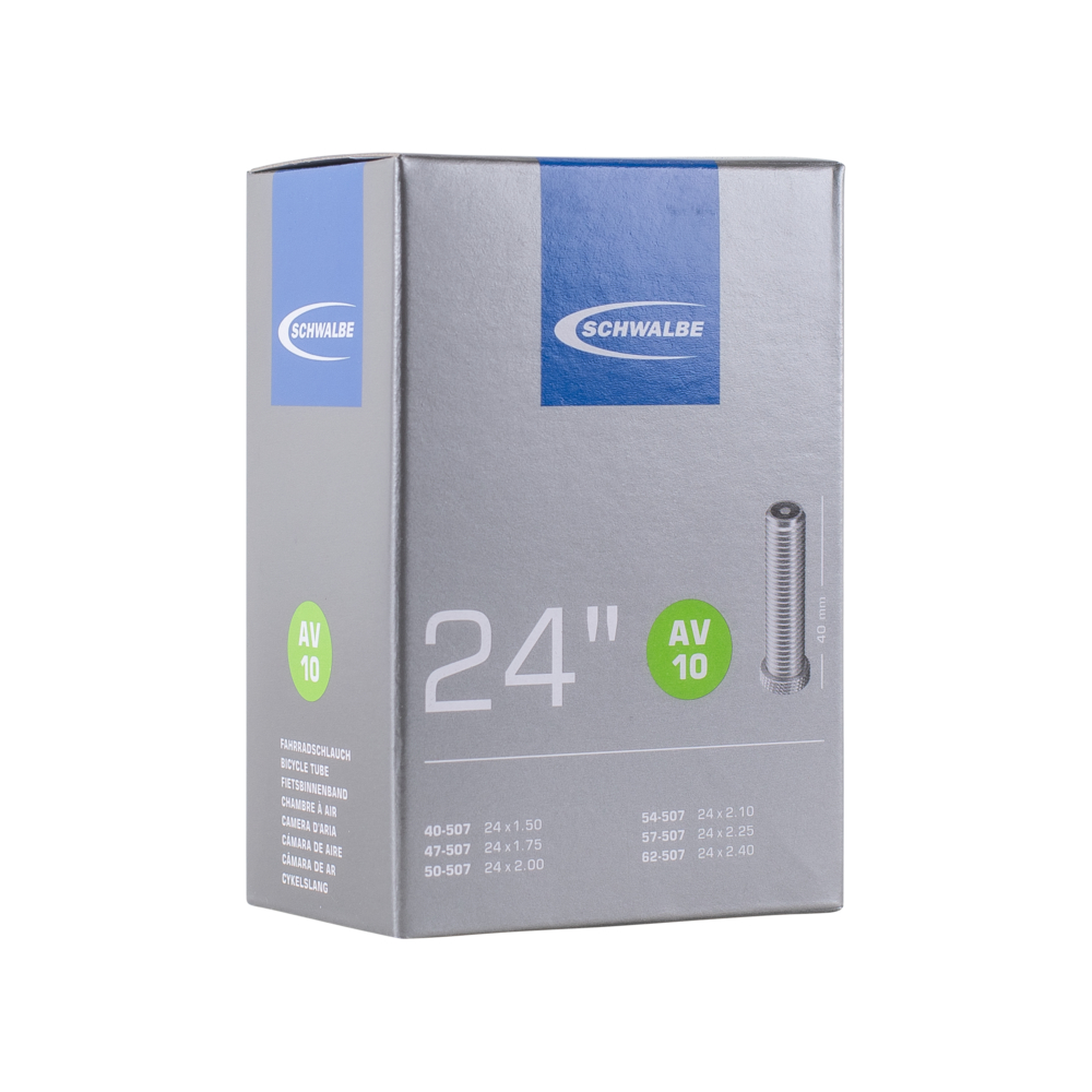 Schwalbe standard bicycle inner tube no. 10 for bicycle tyres in size 24" inch (ETRTO 40/62-507). Retains air for an above-average length of time. Thanks to the best material quality and uniform wall thickness. Maximum reliability, proven millions of times over.