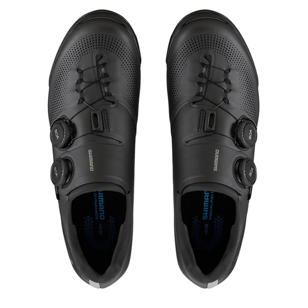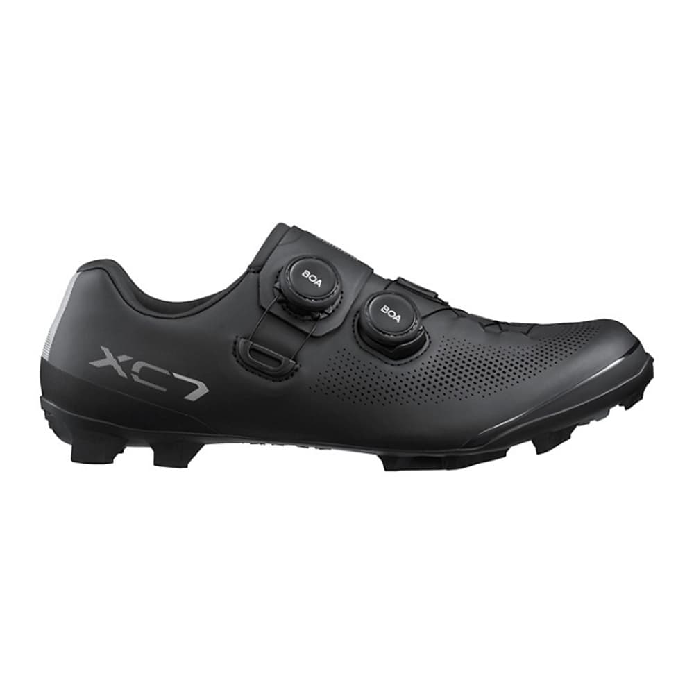 The Shimano XC703 in black is a high-quality cross-country cycling shoe for ambitious and performance-orientated riders who place the highest demands on comfort, control and power transmission. Thanks to its elegant, minimalist design in rich black, it impresses both visually and technically. The lightweight, carbon fibre-reinforced midsole ensures maximum stiffness and optimum pedalling efficiency. With the precise double BOA® L6 twist lock system, the shoe can be adjusted individually, quickly and with millimetre precision, ensuring perfect support and an excellent fit. Strategically placed ventilation zones further improve the foot climate during intensive rides. Robust, dynamic and stylish - the Shimano XC703 Black takes performance and riding pleasure to a new level.